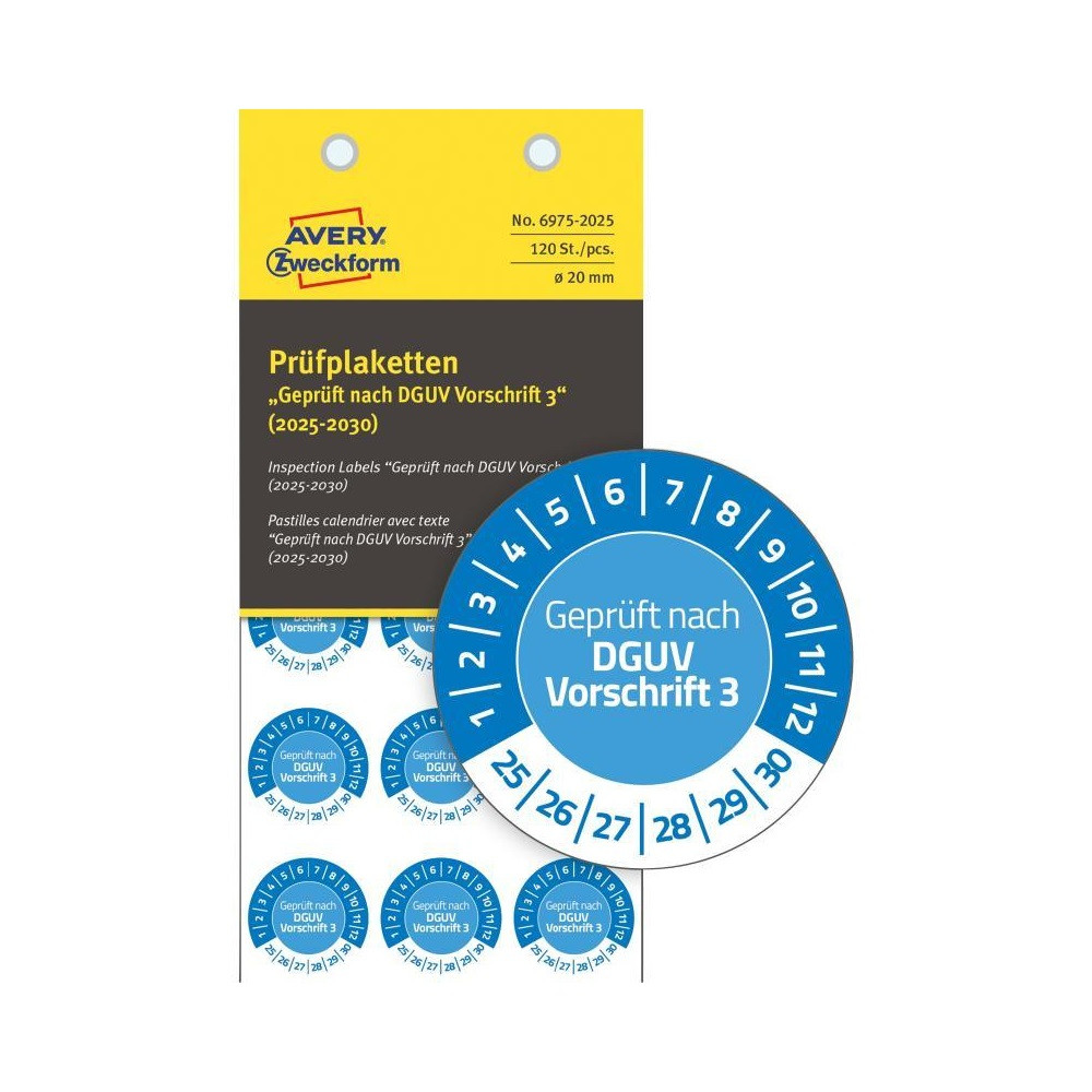 A biztonság fontos: A vállalat teljes felszerelését rendszeresen ellenőrizni kell a biztonság érdekében - ezt mondja a törvény. A plakettek ideálisak az eszközök tesztelésének nyilvántartásához. Használatuk praktikus és segít nyomon követni a tesztelést és a leltárt. A kék színű, kerek O20mm-es átmérőjű ellenőrző plakettek egy praktikus adagolófüzetben különösen könnyen és közvetlenül a helyszínen használhatók. A "DGUV Vorschrift 3" felirattal ellátott és 2025-2030-es éves felirat már ránézésre elárul minden információt. A plakettek különösen időjárás- és karcálló vinilfóliából készülnek. Ezért alkalmasak minden olyan eszközre is, amelyet szabadtéren tárolnak, vagy szélsőséges körülményeknek vannak kitéve. Vízzel, olajjal, tisztítószerekkel, fertőtlenítőszerekkel és oldószerekkel szemben ellenállóak. Egyszerűen jelölje meg az évet és a hónapot markerrel vagy lyukasztóval, és ragassza fel őket. A plakettek megbízhatóan tapadnak számos felületre. Kínálatunkban az előre kinyomtatott plakettek mellett találnak A4-es méretű előre kivágott íveket, melyeket személyre szabhat és kinyomtathat. 15 címke / lap; 8 ív / csomag Katalóguskód: 63850