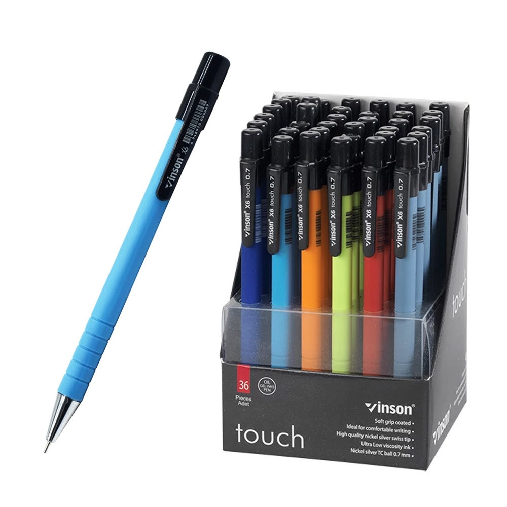 Vinson X6 nyomógombos, cserélhető betétes, gumírozott testű golyóstoll bordázott csúszásmentes fogórésszel. A betét kék színű olajzselés tintát tartalmaz, mely könnyű gördülékeny írást tesz lehetővé. Cserélhető betétes. A tollhoz tartozó betét cikkszáma: 59129