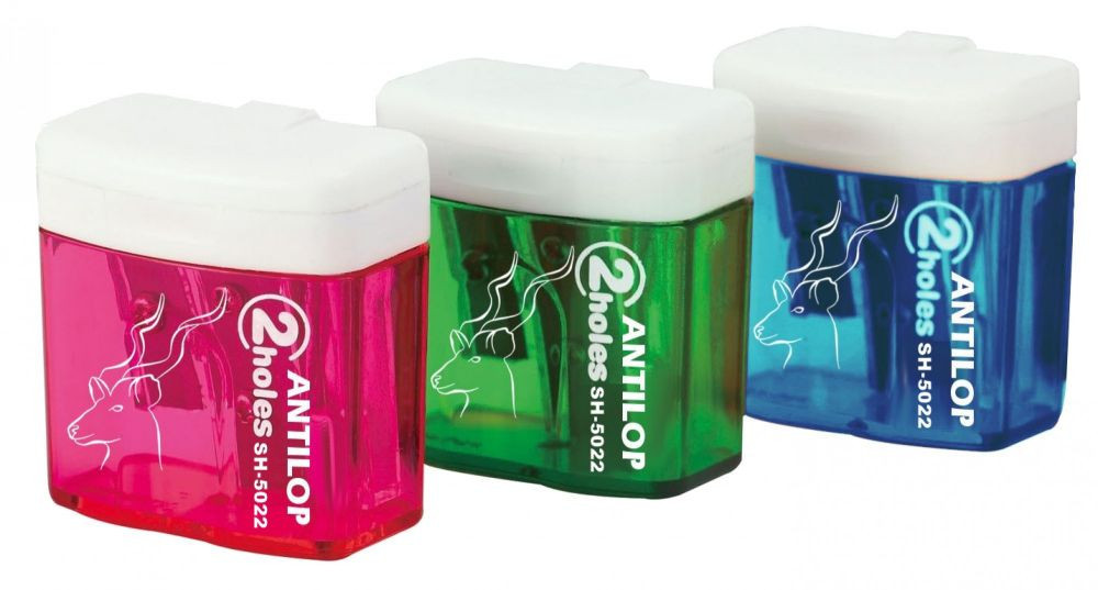 Antilop SH5022 műanyag 2 lyukú tartályos hegyező karton displayben vegyes csomagolással. 12DB/GYŰJTŐ 720DB/KARTON Katalóguskód: 16973