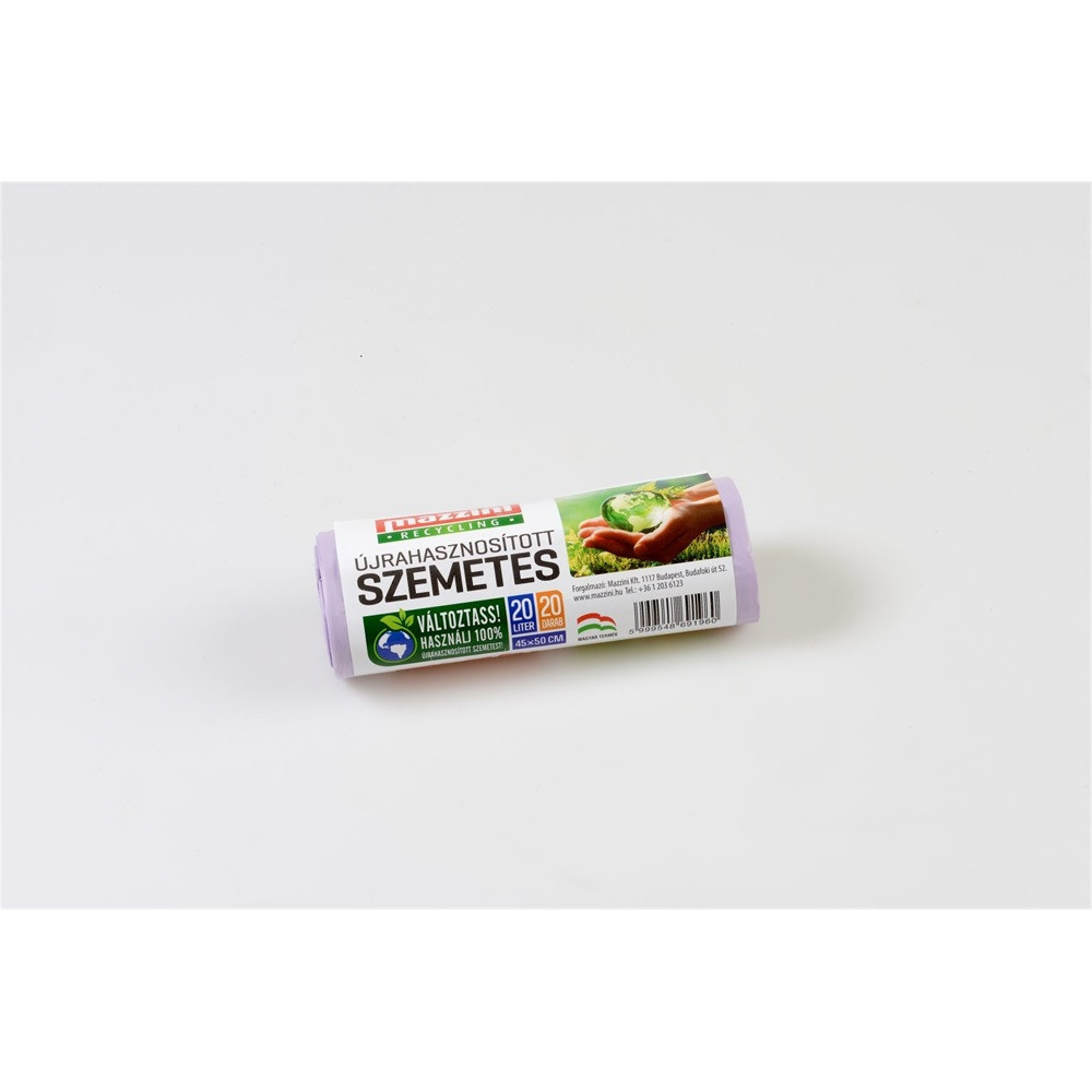 Szemeteszsák újrahasznosított anyagból. A termékek csak a szelektív hulladékgyűjtésből származó PE fóliából készülnek, hatékonyan felhasználva a meglévő műanyag hulladékot, így 100%-ban újrahasznosított PE Szemetesek.