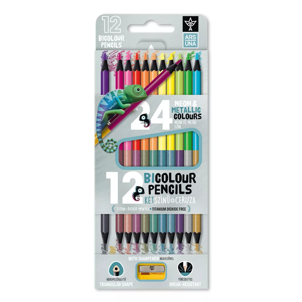 Háromszögletű bicolor neon/metál színes ceruzakészlet, törésálló 3,5 mm-es, TiO2 (titánium-dioxid) mentes ceruzabéllel. A bicolor kialakításnak köszönhetően a 12 db-os ceruzakészletben 24 szín található, a ceruza egyik oldala neon, a másik oldala metál színű. A készlet része egy kiváló minőségű hegyező is. A ceruzatest és a ceruzahegy színe megegyezik. Papír dobozban, a doboz EURO lyukkal ellátva. . Katalóguskód: 65852.